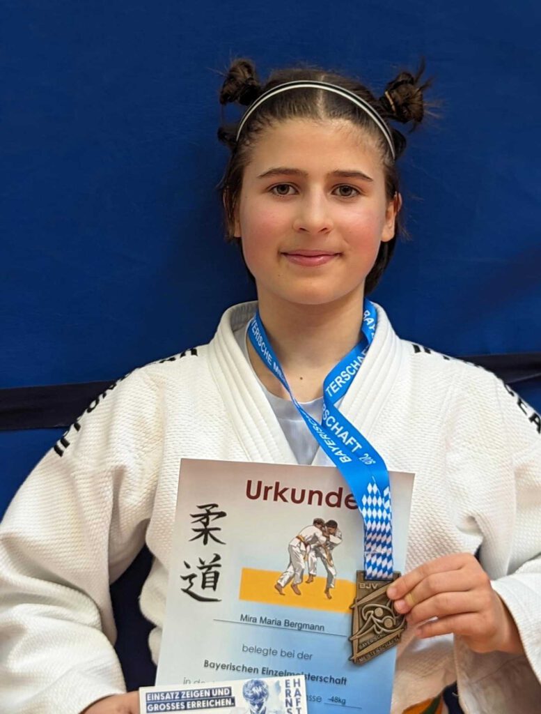 Unsere Nachwuchskämpferin Mira Bergmann konnte am 22.03.2026 auf der Bayrischen Meisterschaft in Judo in ihrer Gewichtsklasse bis 48 kg einen hervorragenden 3. Platz erkämpfen.